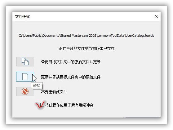 10、迁移中如果弹出提示可以选择“备份并更新”或“更新并替换”并勾选“将此操作应用于所有后续冲突”