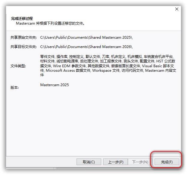 5、勾选“迁移Mastercam共享文件”和“包含子文件夹”,原始文件夹选择2025版本的共享文件,目标文件夹可以选择2026版本的默认共享文件夹位置,也可以另选一个文件夹,迁移完成之后再复制到默认位置即可。